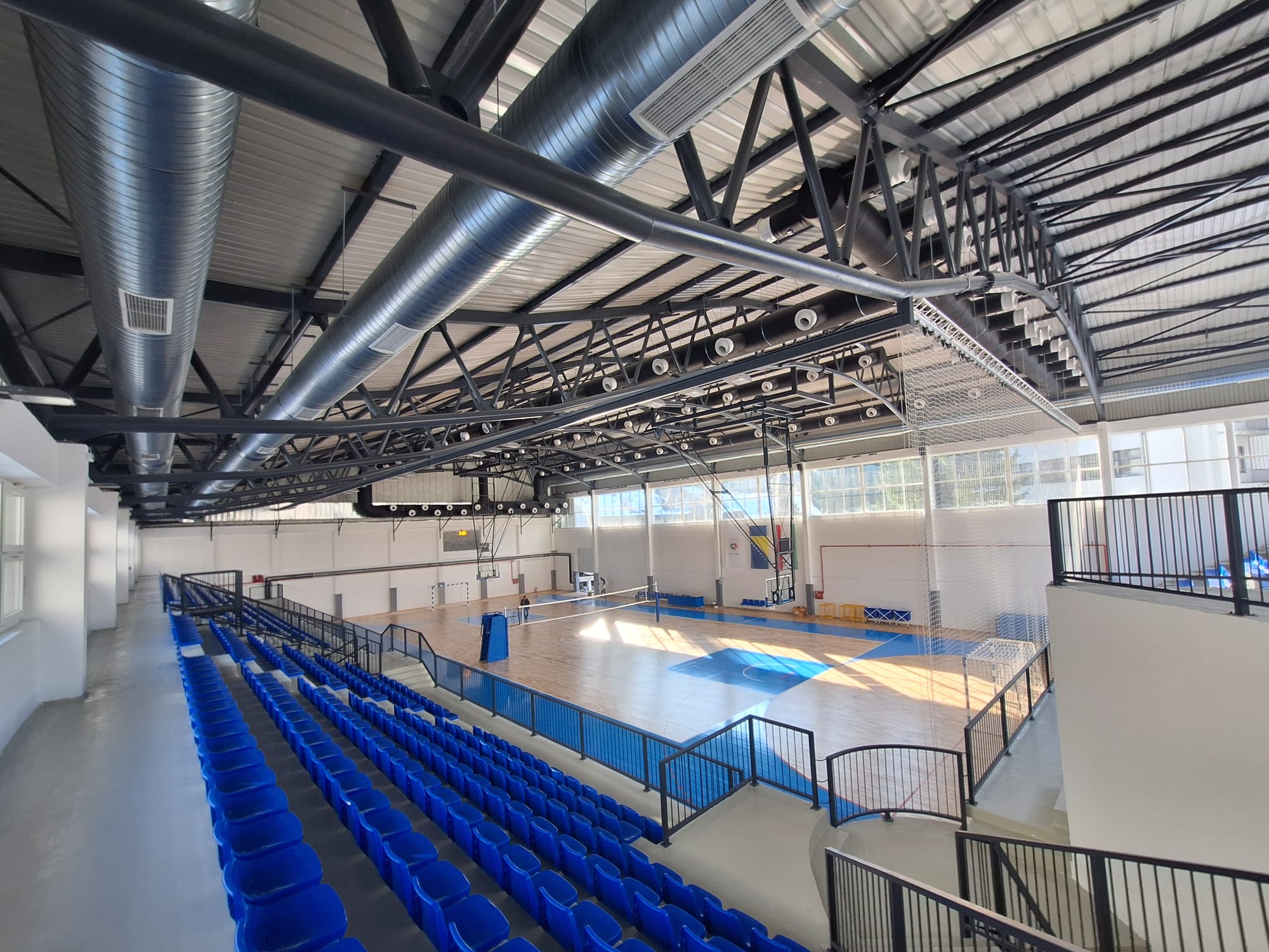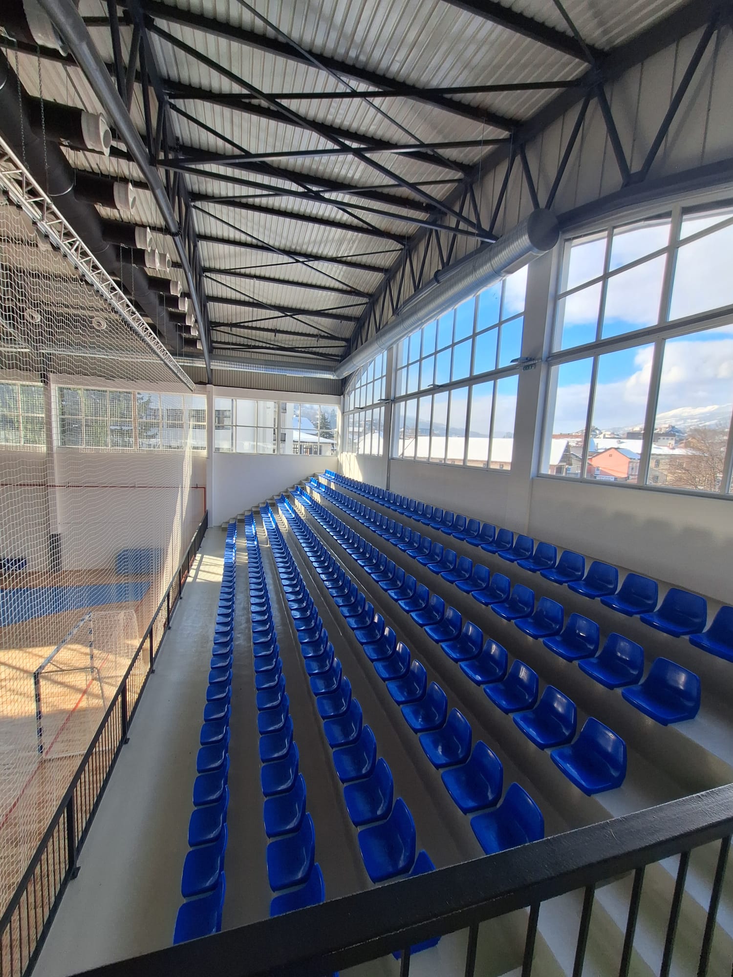 Projekat: - sportski parket FIBA level 1 površina 1080 m2; PVC stolice na tribinama; elektronski sportski semafor za više sportova; elektropodizni stropni koševi; zaštitne mreže iza golova i zaštitna mreža na prozorima dvorane: rukometni IHF golovi, kompletan sistem za odbojku (stubovi, mreža, platforma za suca; meka zaštita subova; klupe za svlačionice i ostala sportska oprema